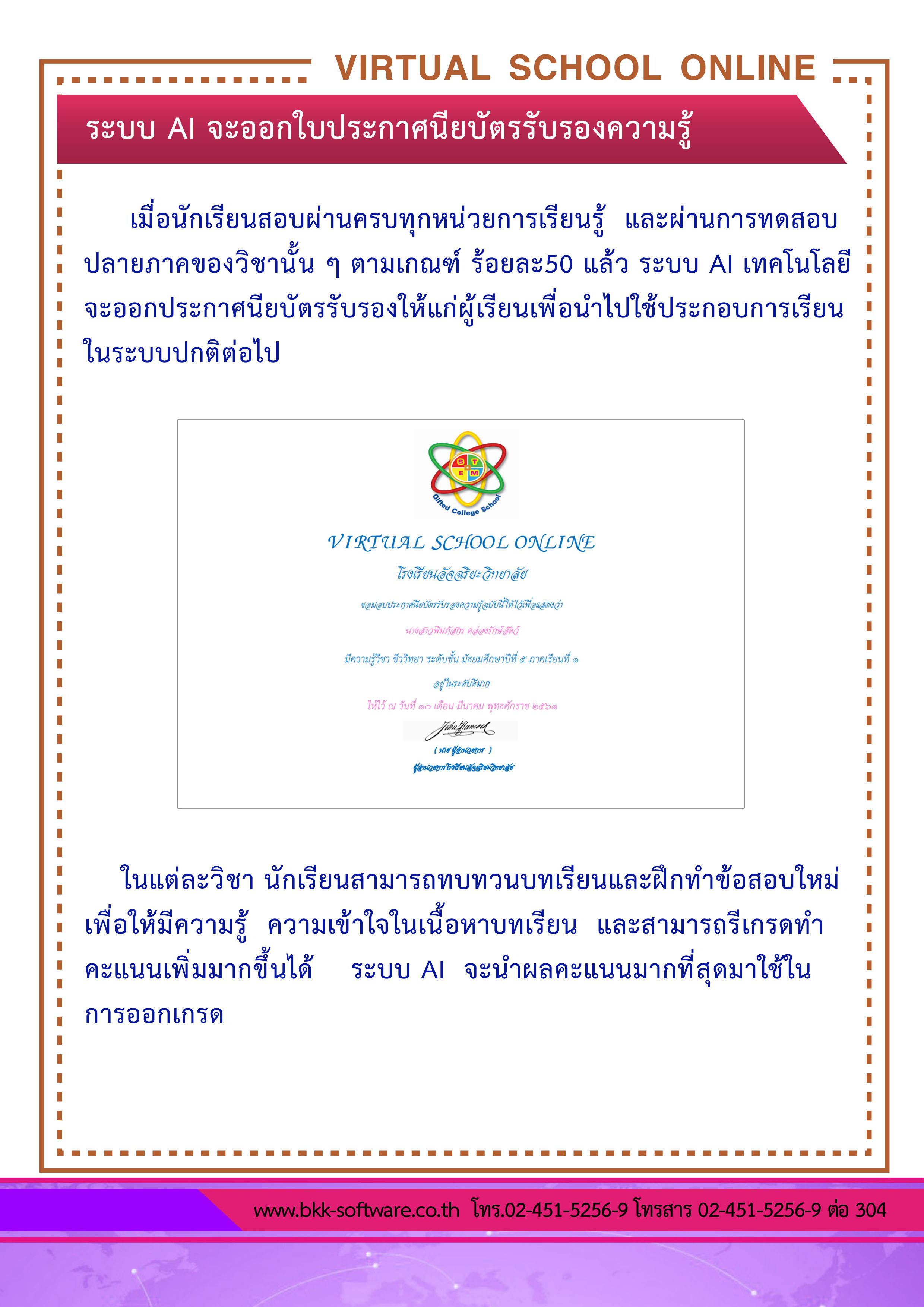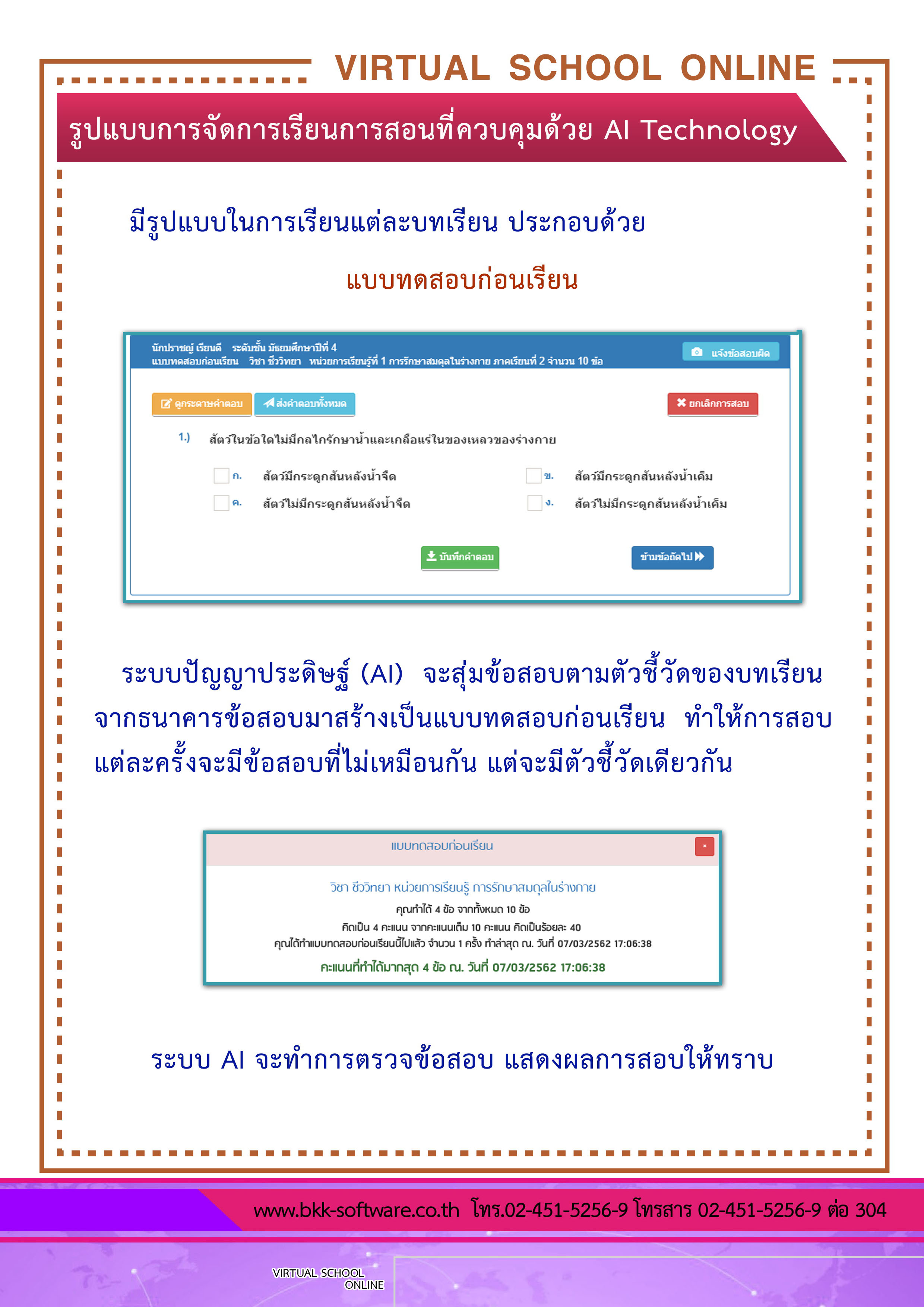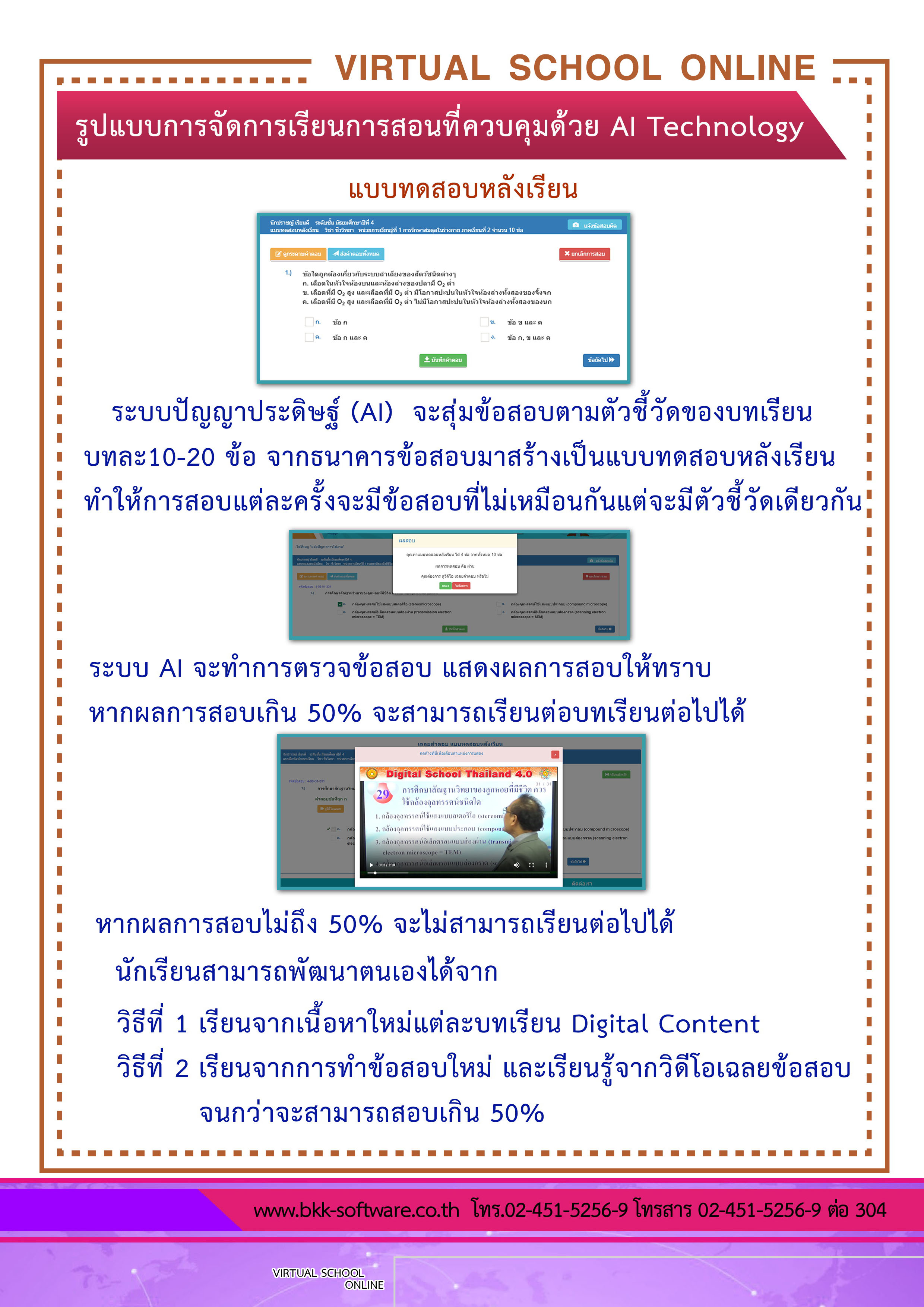 ระบบ virtual School Online เป็นนวัตกรรมใหม่ของการศึกษา เป็นโรงเรียนเสมือนจริงในยุคดิจิทัล ที่วัดผลสัมฤทธิ์ทางการเรียนด้วยระบบ Artificial Intelligence หรือ AI ระบบนี้จะเป็นเครื่องมือสำหรับโรงเรียน ครู และผู้ปกครอง ที่จะช่วยเพิ่มดคะแนน O-NET , GAT , PAT และ 9 วิชาสามัญ ของนักเรียนให้สูงขึ้น