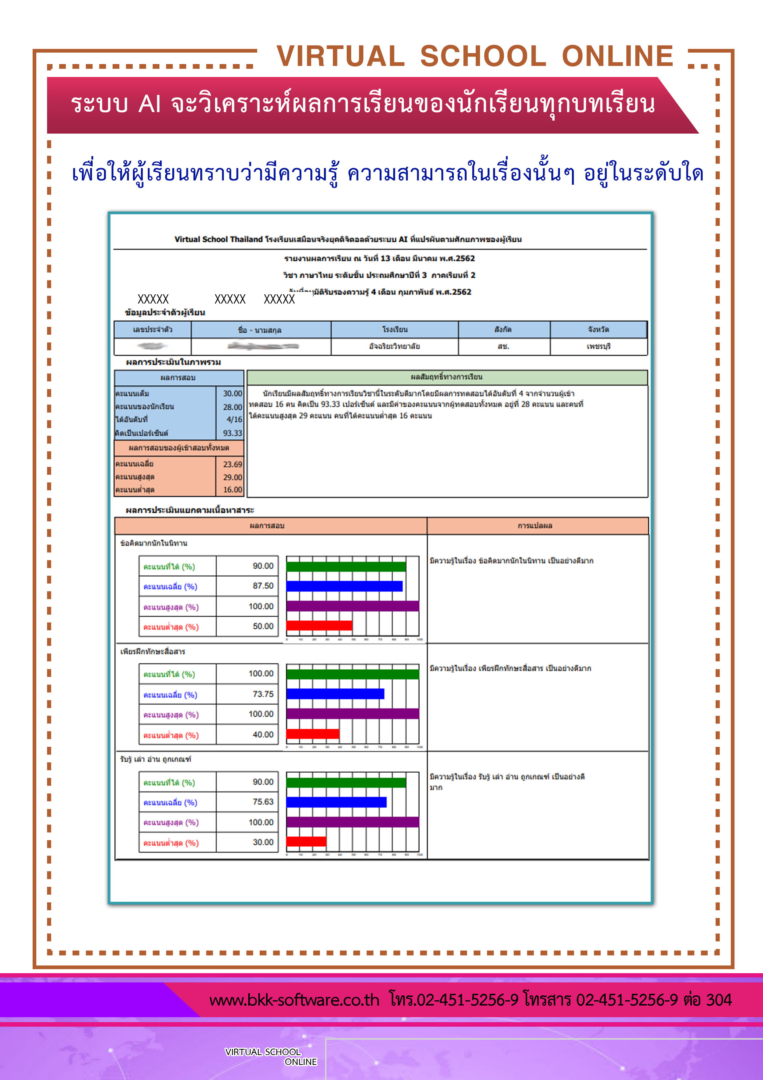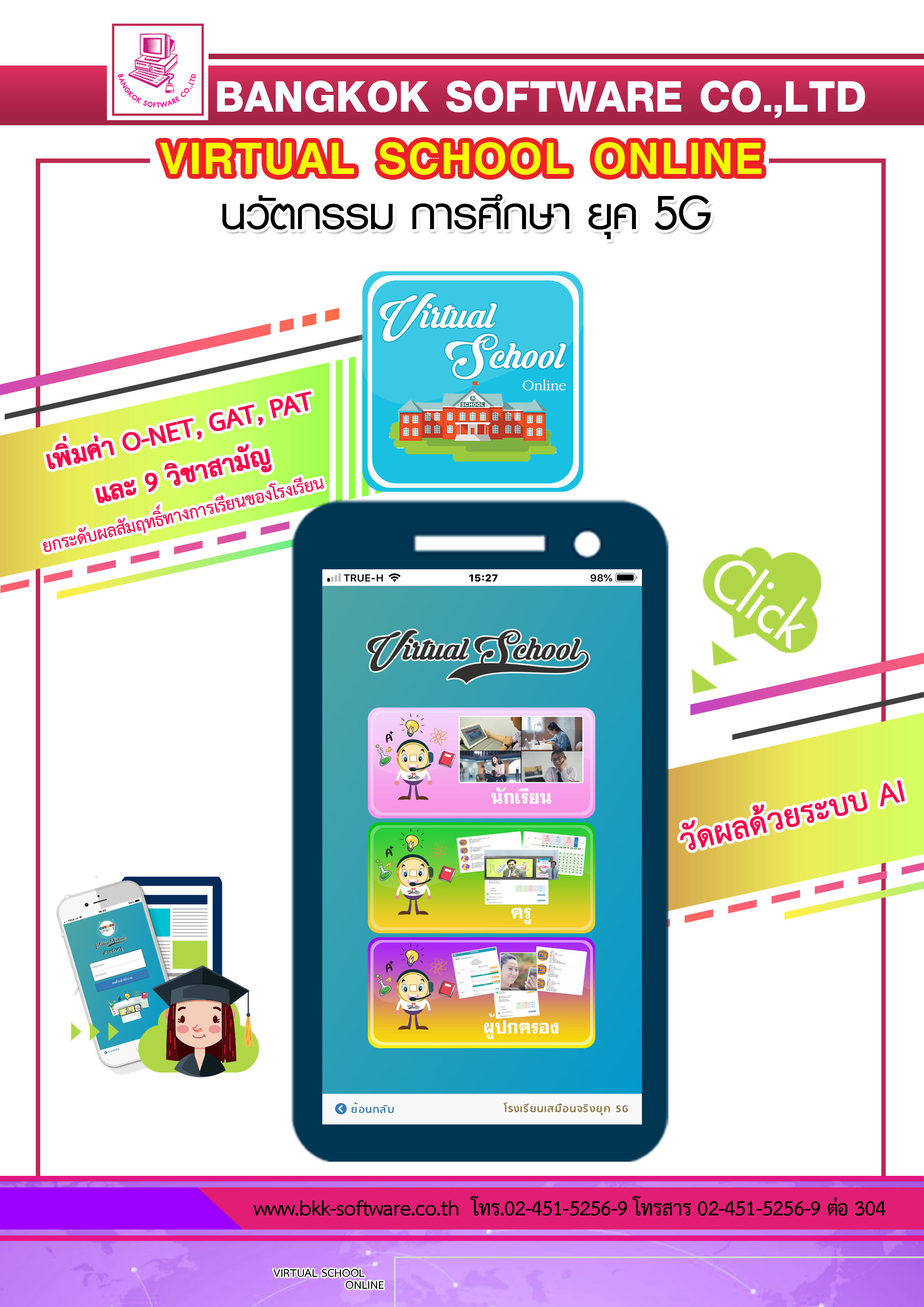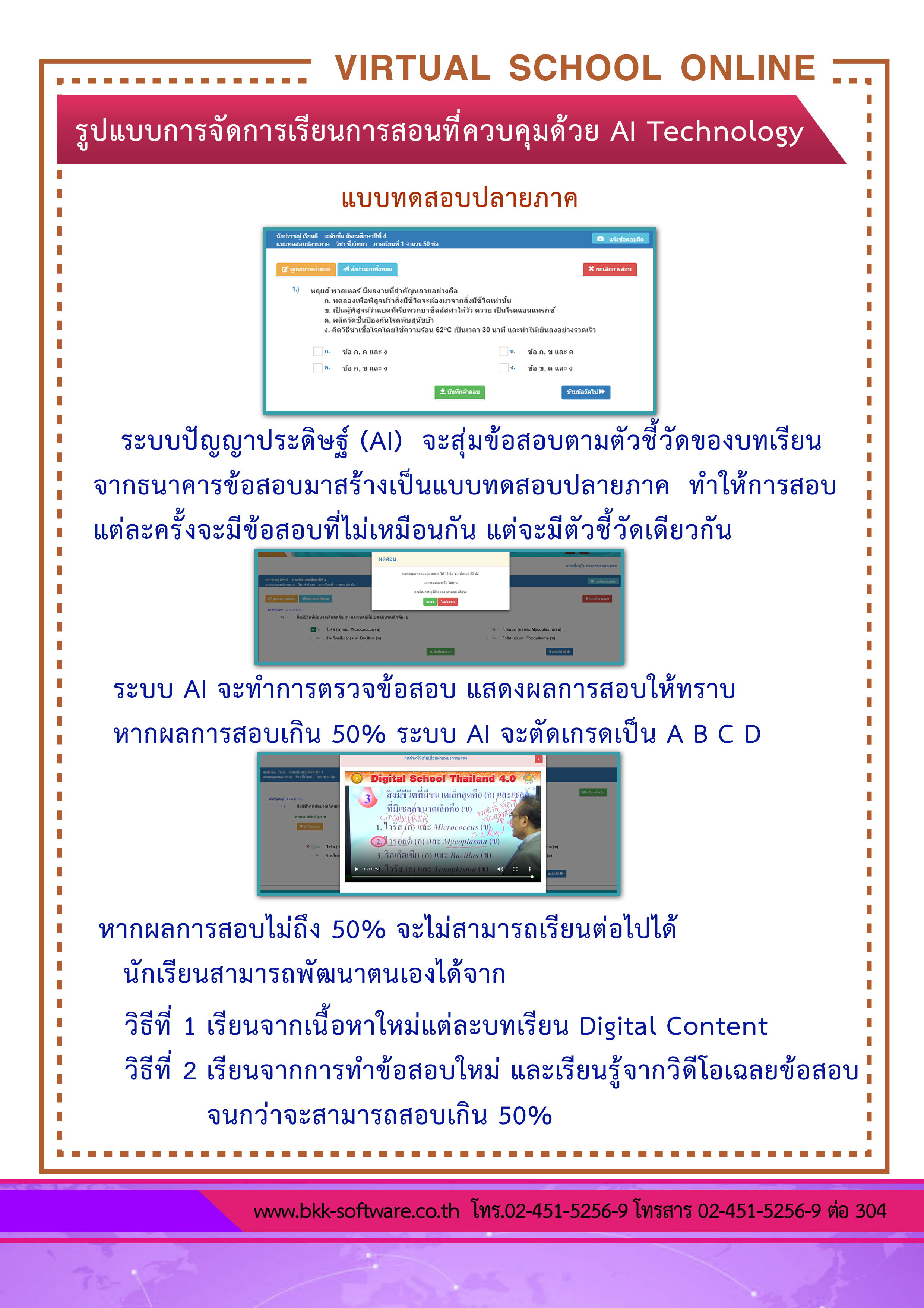 ระบบ virtual School Online เป็นนวัตกรรมใหม่ของการศึกษา เป็นโรงเรียนเสมือนจริงในยุคดิจิทัล ที่วัดผลสัมฤทธิ์ทางการเรียนด้วยระบบ Artificial Intelligence หรือ AI ระบบนี้จะเป็นเครื่องมือสำหรับโรงเรียน ครู และผู้ปกครอง ที่จะช่วยเพิ่มดคะแนน O-NET , GAT , PAT และ 9 วิชาสามัญ ของนักเรียนให้สูงขึ้น