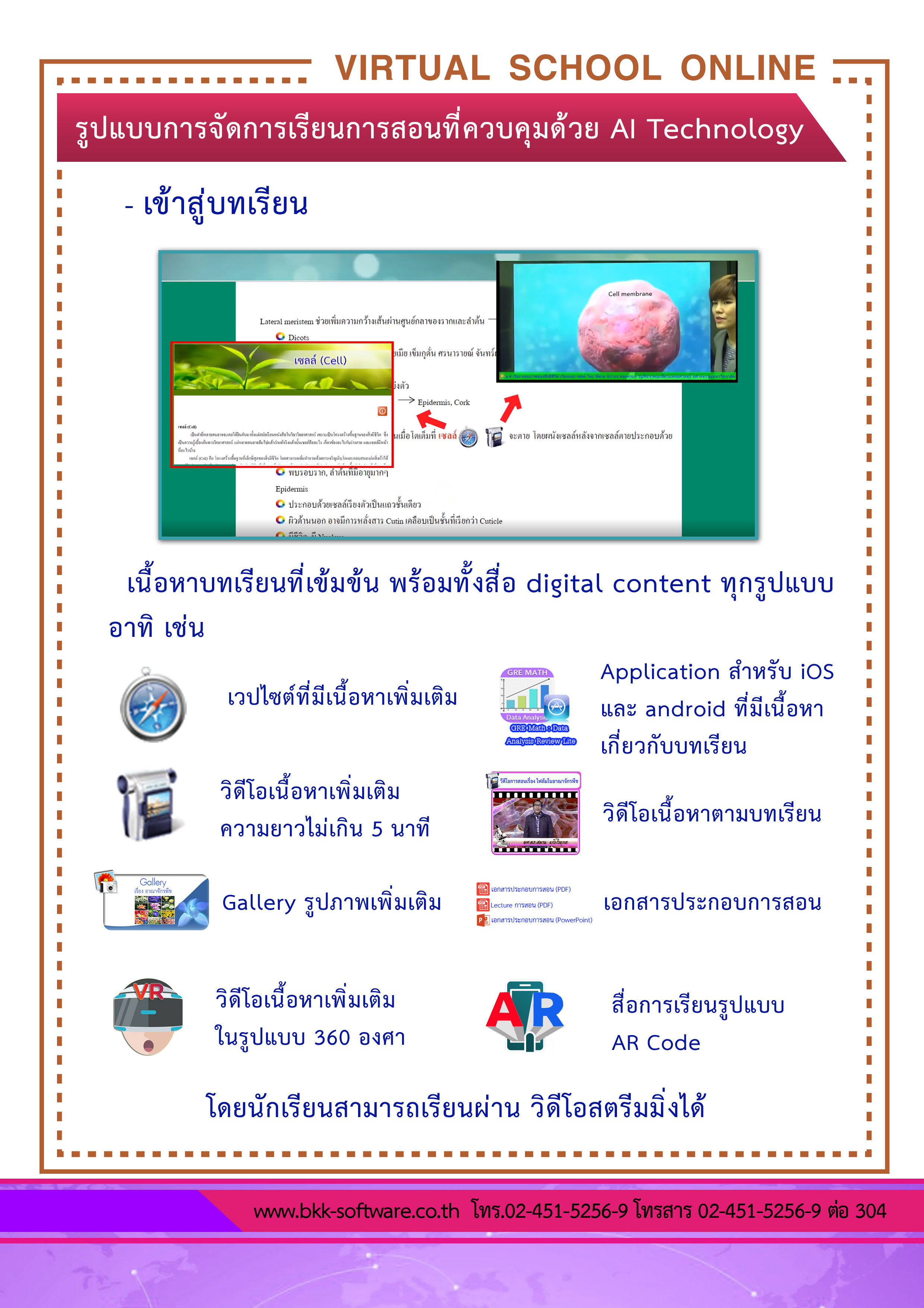 ระบบ virtual School Online เป็นระบบการเรียนการสอนด้วยระบบออนไลน์ที่สามารถเรียนได้ทุกที่ ทุกเวลา ตามความต้องการของนักเรียน และนักเรียนสามารถเรียนทบทวนบทเรียนซ้ำกี่ครั้งก็ได้ เนื้อหาบทเรียน สอดคล้องกับหลักสูตรแกนกลางการศึกษาขั้นพื้นฐาน พ.ศ.2551 เป็นะบบที่ผู้เรียนจะต้องเรียนและทำแบบทดสอบให้ผ่านเกณฑ์ที่กำหนดในแต่ละวิชา สามารถออกใบประกาศนียบัตรรับรองความรู้ให้แก่ผู้เรียนด้วยระบบ AI และ ระบบนี้ท่านผู้ปกครอง ครูผู้สอน สามารถติดตามผลการเรียนแบบ Real Time ได้จาก Application และระบบนี้ รองรับการใช้งานทุกอุปกรณ์และทุกระบบปฏิบัติการ |